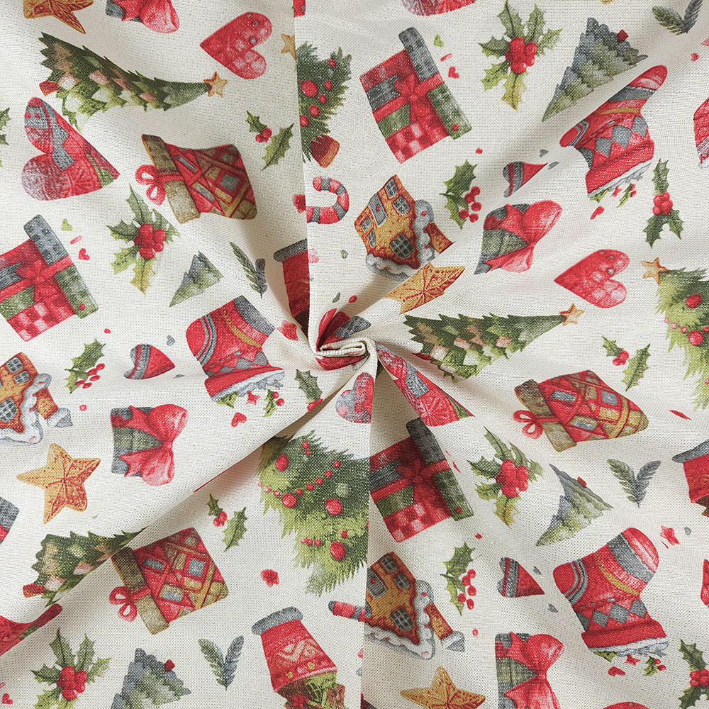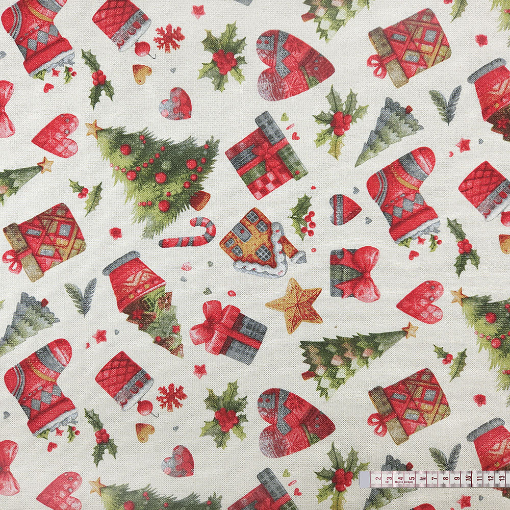 Ez az ajándékos ünnepi csillogás mintájú dekorszövet sokoldalú, erős és esztétikus anyag, amely tökéletes választás, ha tartós és mutatós textíliát keresel. Kevert szálas összetételének köszönhetően jobban bírja a mindennapi igénybevételt, mint a hagyományos vászon, így ideális párnák, táskák, asztalterítők és különféle lakásdekorációk készítéséhez.