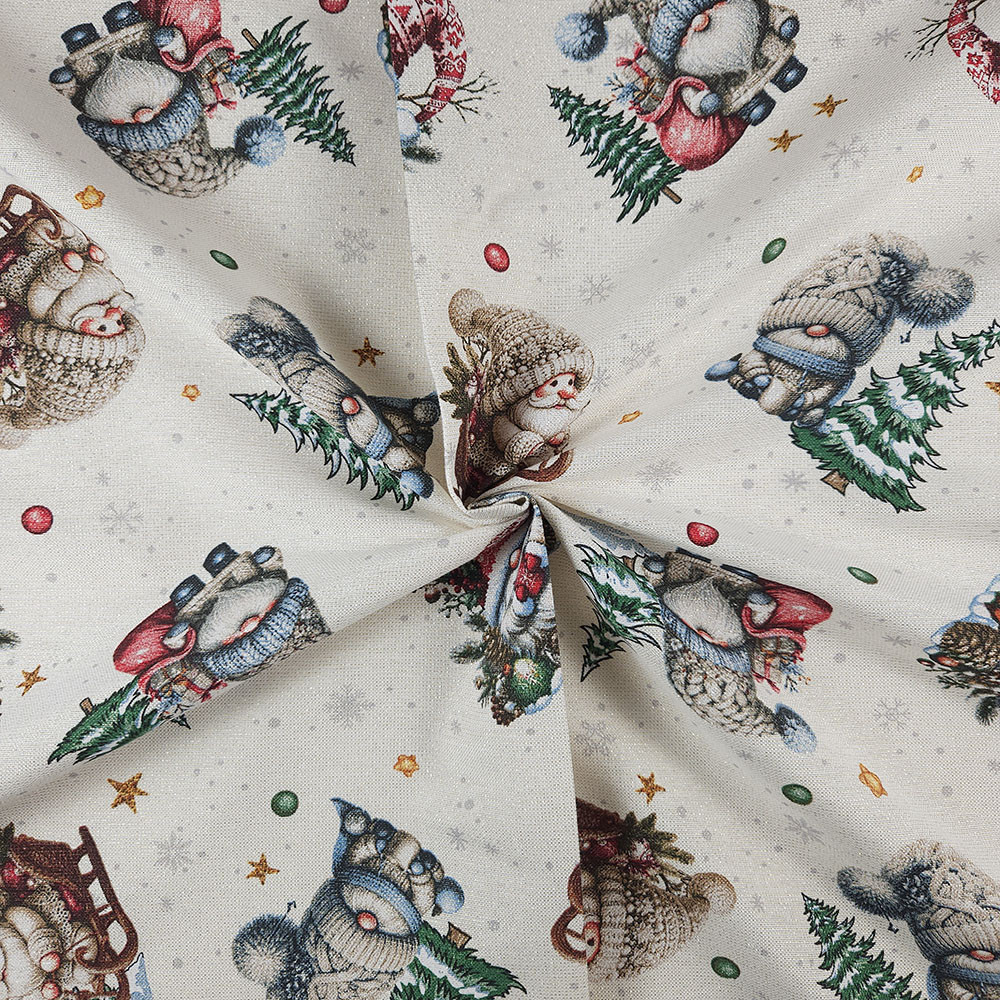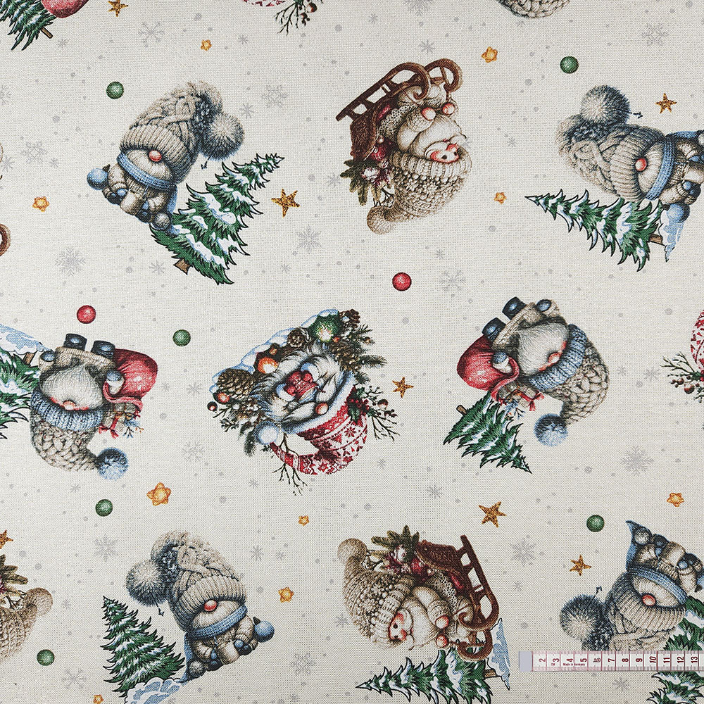 Ez a csillogó ünnepi manóvilág dekorszövet sokoldalú, erős és esztétikus anyag, amely tökéletes választás, ha tartós és mutatós textíliát keresel. Kevert szálas összetételének köszönhetően jobban bírja a mindennapi igénybevételt, mint a hagyományos vászon, így ideális párnák, táskák, asztalterítők és különféle lakásdekorációk készítéséhez.
