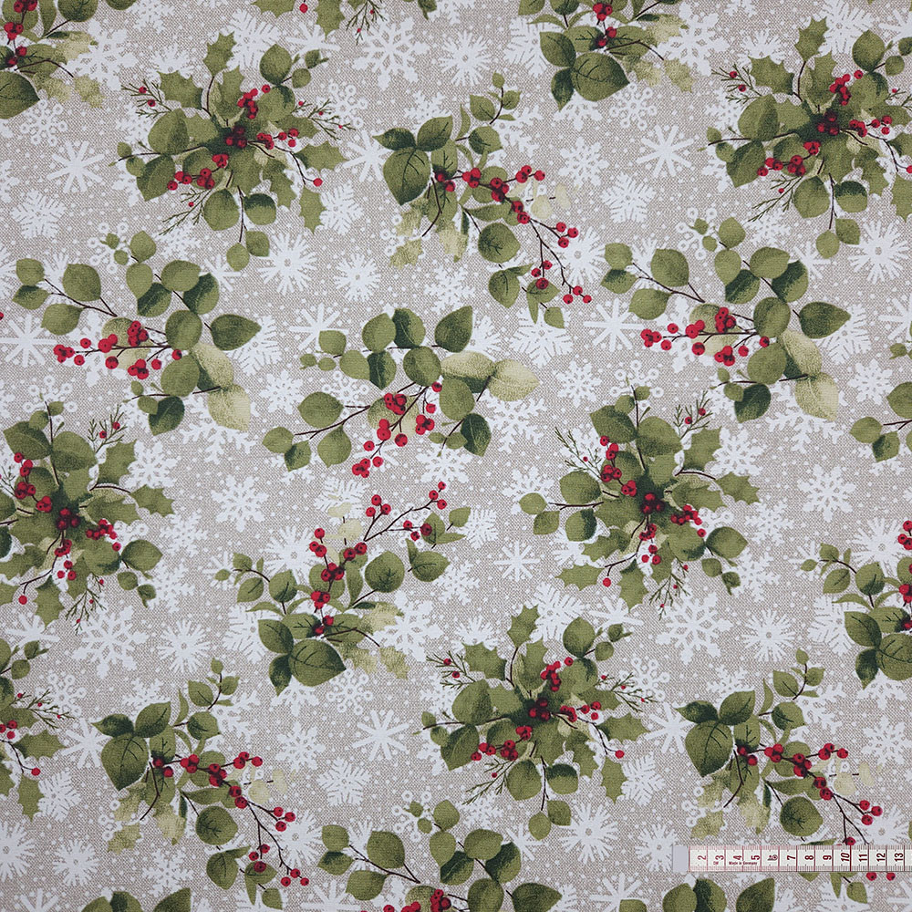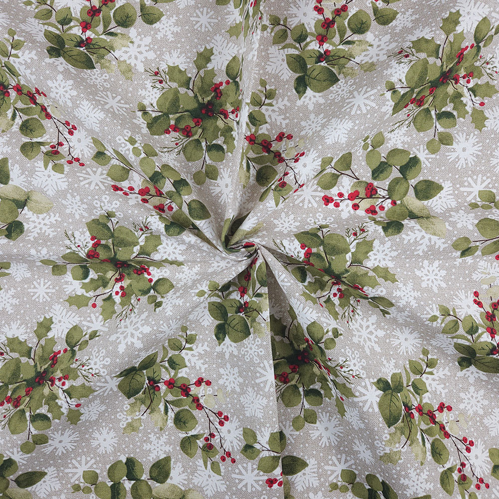 Ez a hópehely és magyal mintájú karácsonyi dekorszövet sokoldalú, erős és esztétikus anyag, amely tökéletes választás, ha tartós és mutatós textíliát keresel. Kevert szálas összetételének köszönhetően jobban bírja a mindennapi igénybevételt, mint a hagyományos vászon, így ideális párnák, táskák, asztalterítők és különféle lakásdekorációk készítéséhez.