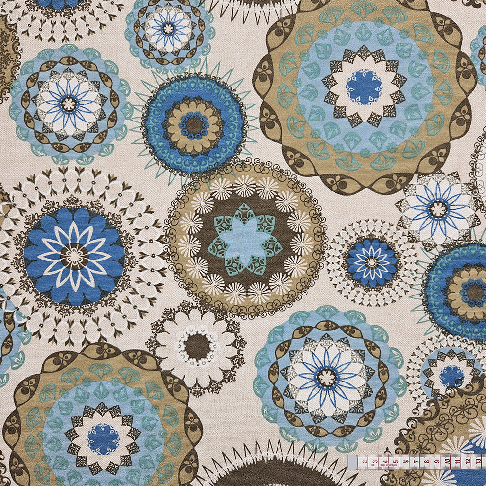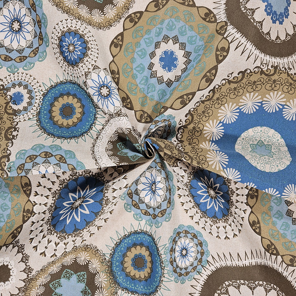 Ez a keki, türkíz mandala dekorszövet sokoldalú, erős és esztétikus anyag, amely tökéletes választás, ha tartós és mutatós textíliát keresel. Kevert szálas összetételének köszönhetően jobban bírja a mindennapi igénybevételt, mint a hagyományos vászon, így ideális párnák, táskák, asztalterítők és különféle lakásdekorációk készítéséhez.