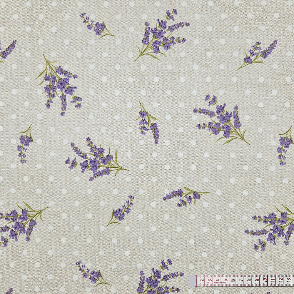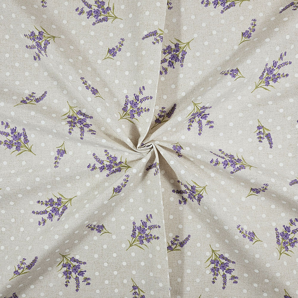 Ez a levendulás pöttyös dekorszövet sokoldalú, erős és esztétikus anyag, amely tökéletes választás, ha tartós és mutatós textíliát keresel. Kevert szálas összetételének köszönhetően jobban bírja a mindennapi igénybevételt, mint a hagyományos vászon, így ideális párnák, táskák, asztalterítők és különféle lakásdekorációk készítéséhez.
