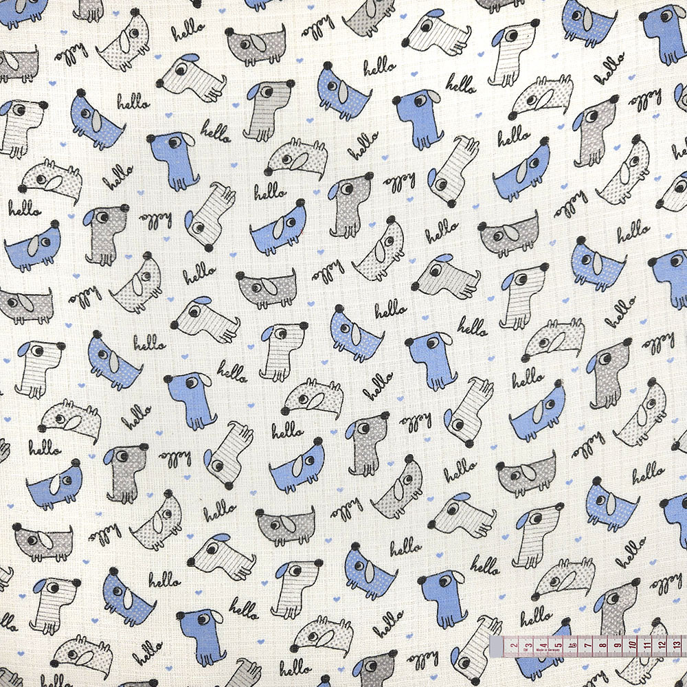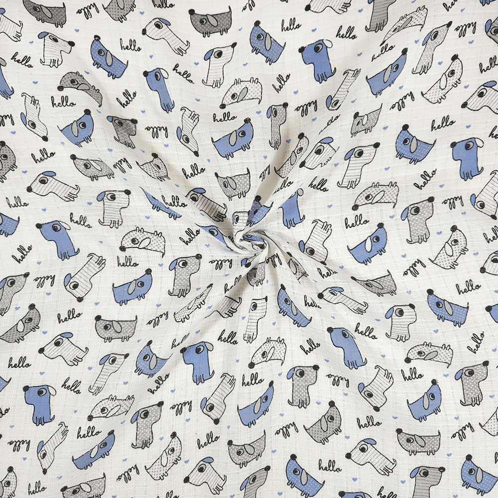 Ez a hello kutyák mintás pelenka anyag fehér alapon vidám állatfigurákkal díszített, 100% pamutból készült tetra textil.