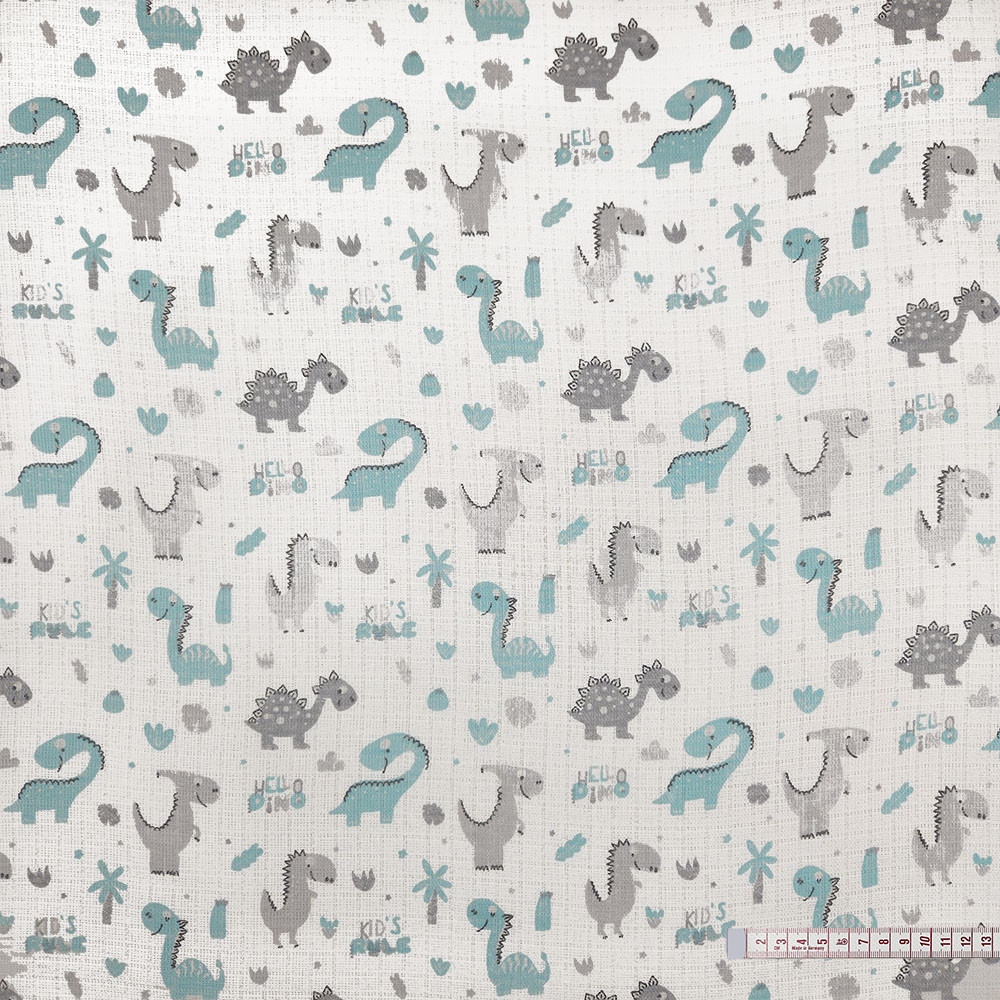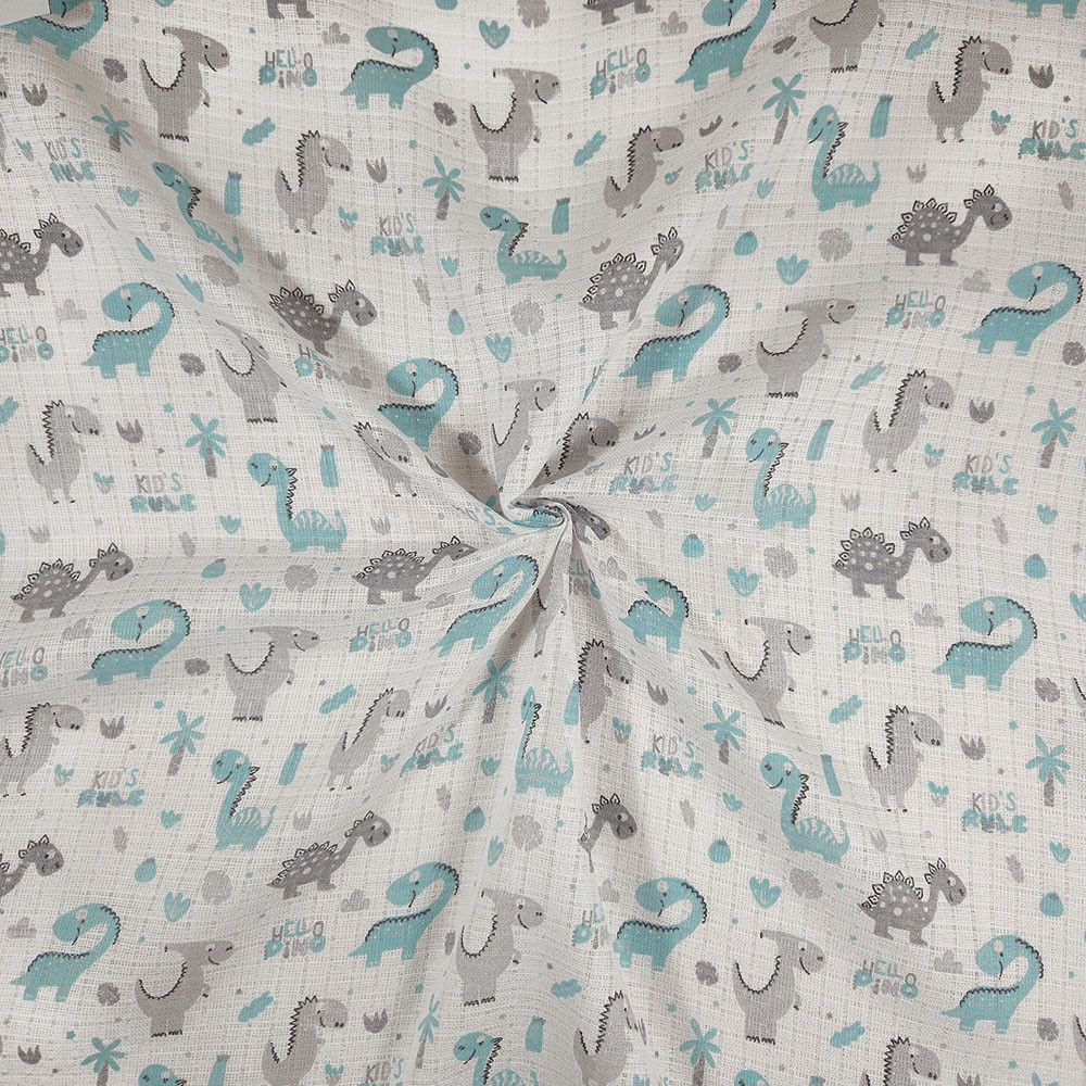 Ez a kék és szürke dínók mintás pelenka anyag fehér alapon vidám állatfigurákkal díszített, 100% pamutból készült tetra textil.