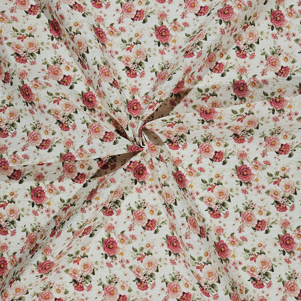 Ez a rózsaszín apró rózsás dekorszövet sokoldalú, erős és esztétikus anyag, amely tökéletes választás, ha tartós és mutatós textíliát keresel. Kevert szálas összetételének köszönhetően jobban bírja a mindennapi igénybevételt, mint a hagyományos vászon, így ideális párnák, táskák, asztalterítők és különféle lakásdekorációk készítéséhez.