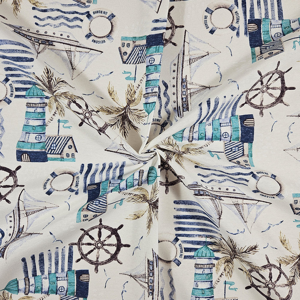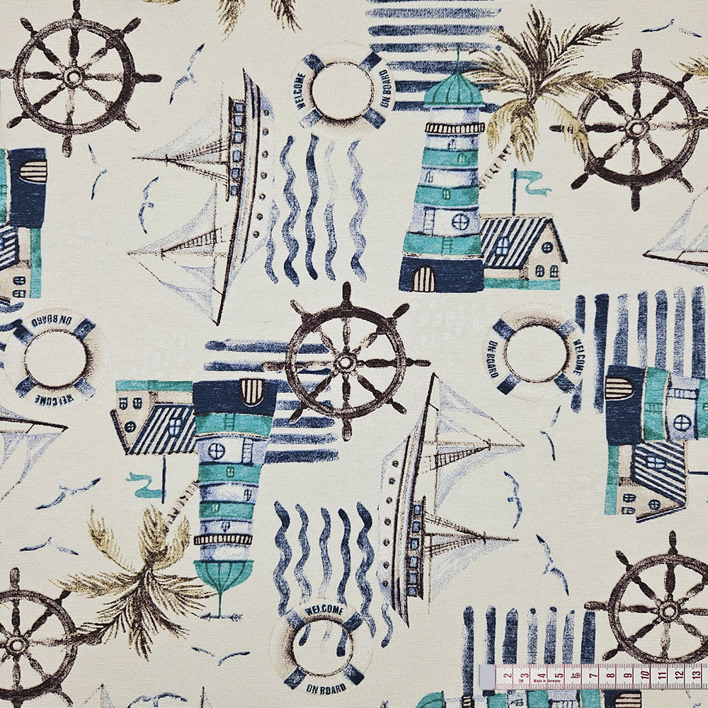 Ez a tengeri kaland mintás dekorszövet sokoldalú, erős és esztétikus anyag, amely tökéletes választás, ha tartós és mutatós textíliát keresel. Kevert szálas összetételének köszönhetően jobban bírja a mindennapi igénybevételt, mint a hagyományos vászon, így ideális párnák, táskák, asztalterítők és különféle lakásdekorációk készítéséhez.